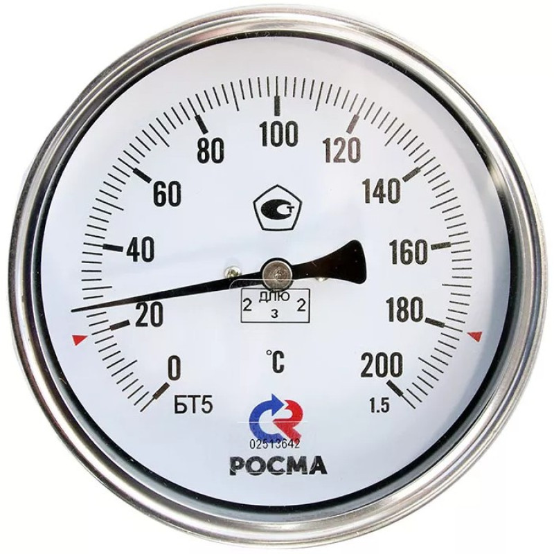Термометр биметаллический Росма БТ-51.212 до 450°С L=200мм G1/2 1.5 осевое присоединение в комплекте с защитной погружной гильзой из нержавеющей стали предназначен для измерения температуры агрессивных сред, жидкостей, пара и газов в отопительных и санитарных установках, в системах кондиционирования и вентиляции. Принцип действия прибора основан на зависимости деформации чувствительного элемента от измеряемой температуры. В качестве чувствительного элемента используется биметаллическая пружина. Она изготавливается из двух прочно соединенных металлических пластин, имеющих различные температурные коэффициенты линейного расширения. При изменении температуры пружина изгибается и вращает стрелку термометра. Один её конец закреплен внутри штока, а к другому присоединяется ось стрелки.