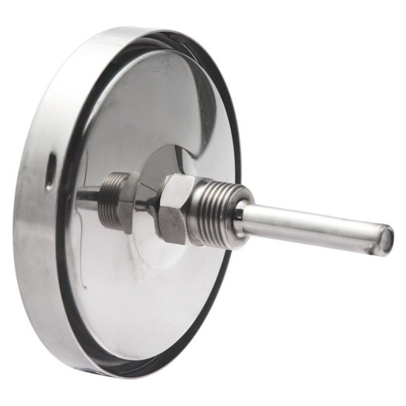 БТ-51.220(0-160С)G1/2.64.1,5. Коррозионностойкий термометр с осевым присоединением и резьбой на штоке. Предназначен для измерения температуры агрессивных жидкостей и газов. Принцип действия термометра основан на зависимости деформации чувствительного элемента от измеряемой температуры. В качестве чувствительного элемента используется биметаллическая пружина. Биметаллическая пружина изготавливается из двух прочно соединенных металлических пластин, имеющих различные температурные коэффициенты линейного расширения. При изменении температуры пружина изгибается и вращает стрелку термометра. Один конец пружины закреплен внутри штока, а к другому присоединяется ось стрелки.