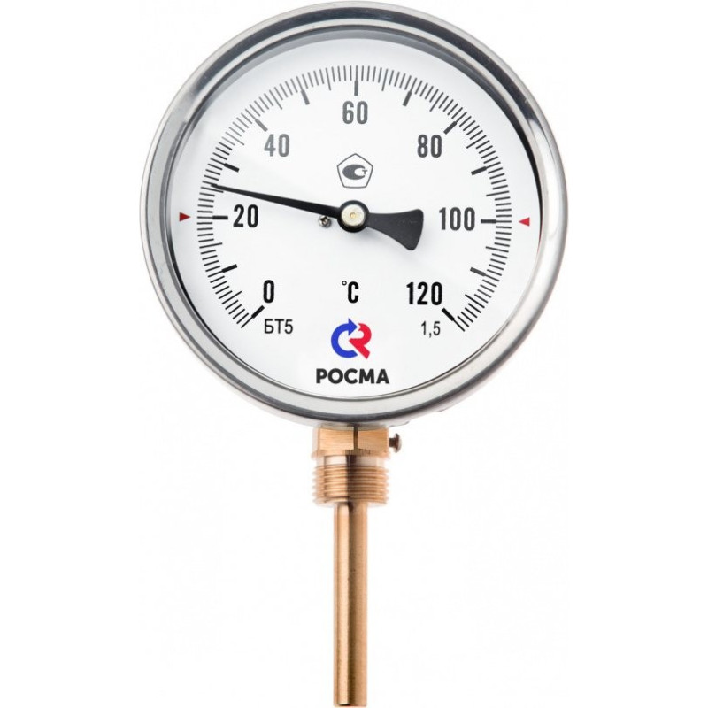 БТ-52.211 (-30...70С) M20x1,5.100.1,5. Радиальное присоединение в комплекте с защитной латунной гильзой. Термометр радиальный биметаллический предназначен для измерения температуры жидкостей, пара и газов в отопительных и санитарных установках, в системах кондиционирования и вентиляции. Принцип действия термометра основан на зависимости деформации чувствительного элемента от измеряемой температуры. В качестве чувствительного элемента используется биметаллическая пружина. Биметаллическая пружина изготавливается из двух прочно соединенных металлических пластин, имеющих различные температурные коэффициенты линейного расширения. При изменении температуры пружина изгибается и вращает стрелку термометра. Один конец пружины закреплен внутри штока, а к другому присоединяется ось стрелки. Корпус термометра изготавливается из коррозионностойкой стали, шток — из нержавеющей стали.