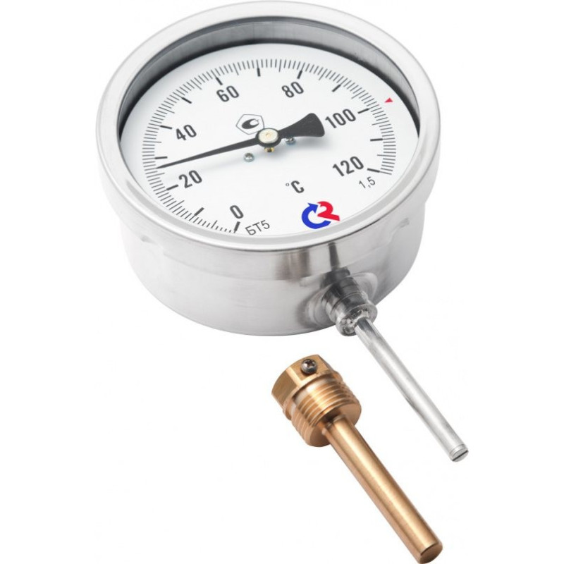 БТ-52.211 (0...250С)M20x1,5.64.1,5. Радиальное присоединение в комплекте с защитной латунной гильзой. Термометр радиальный биметаллический предназначен для измерения температуры жидкостей, пара и газов в отопительных и санитарных установках, в системах кондиционирования и вентиляции. Принцип действия термометра основан на зависимости деформации чувствительного элемента от измеряемой температуры. В качестве чувствительного элемента используется биметаллическая пружина. Биметаллическая пружина изготавливается из двух прочно соединенных металлических пластин, имеющих различные температурные коэффициенты линейного расширения. При изменении температуры пружина изгибается и вращает стрелку термометра. Один конец пружины закреплен внутри штока, а к другому присоединяется ось стрелки. Корпус термометра изготавливается из коррозионностойкой стали, шток — из нержавеющей стали.