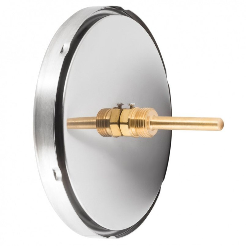 БТ-71.211(0-160С)G1/2.64.1,5. Термометр биметаллический (осевое присоединение) в комплекте с защитной латунной погружной гильзой. Прибор предназначен для измерения температуры жидкостей, пара и газов в отопительных и санитарных установках, в системах кондиционирования и вентиляции. Принцип действия термометра основан на зависимости деформации чувствительного элемента от измеряемой температуры. В качестве чувствительного элемента используется биметаллическая пружина. Она изготавливается из двух прочно соединенных металлических пластин, имеющих различные температурные коэффициенты линейного расширения. При изменении температуры пружина изгибается и вращает стрелку термометра. Один конец пружины закреплен внутри штока, а к другому присоединяется ось стрелки. Корпус термометра изготавливается из коррозионностойкой стали, шток — из нержавеющей стали.