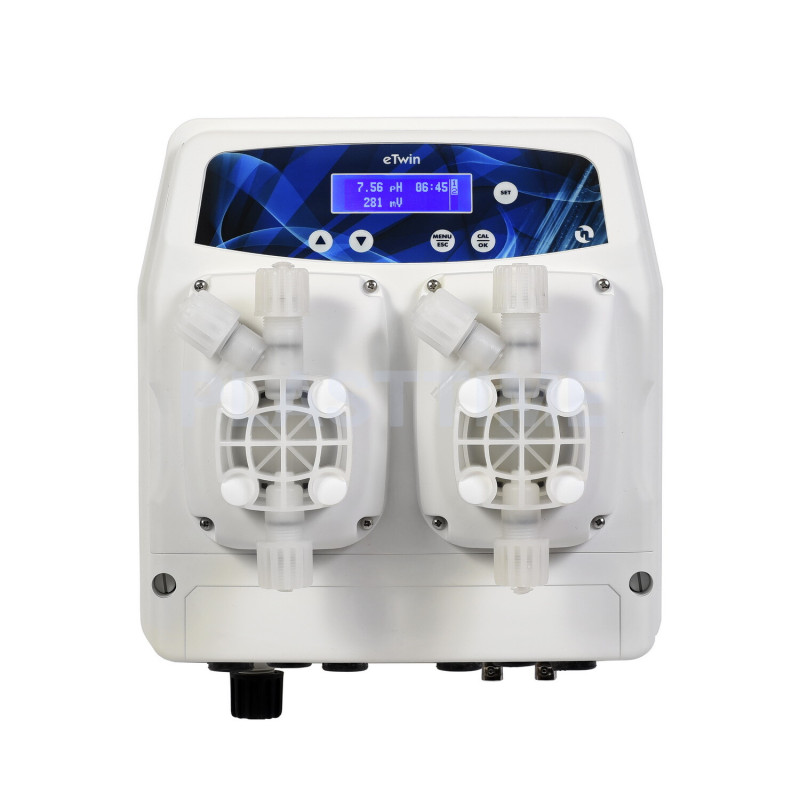 eTwin – простая в использовании станция дозирования и контроля уровня рН и Redox (или свободного хлора) для плавательных бассейнов, объёмом до 500 м3, которая состоит из двух мембранных дозирующих насосов и контроллера, встроенных в один корпус.