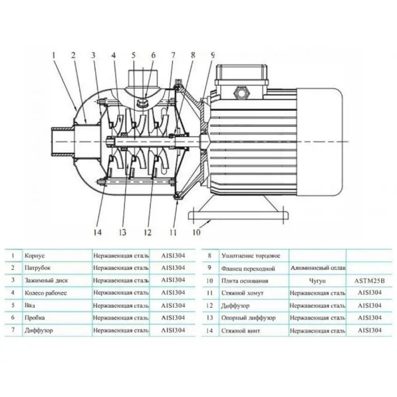 - Рабочие колеса и диффузоры: нержавеющая сталь AISI 304. Рабочие колеса изготовлены методами штамповки и сварки из листовой нержавеющей стали и установлены на удлиненном валу электродвигателя консольно.