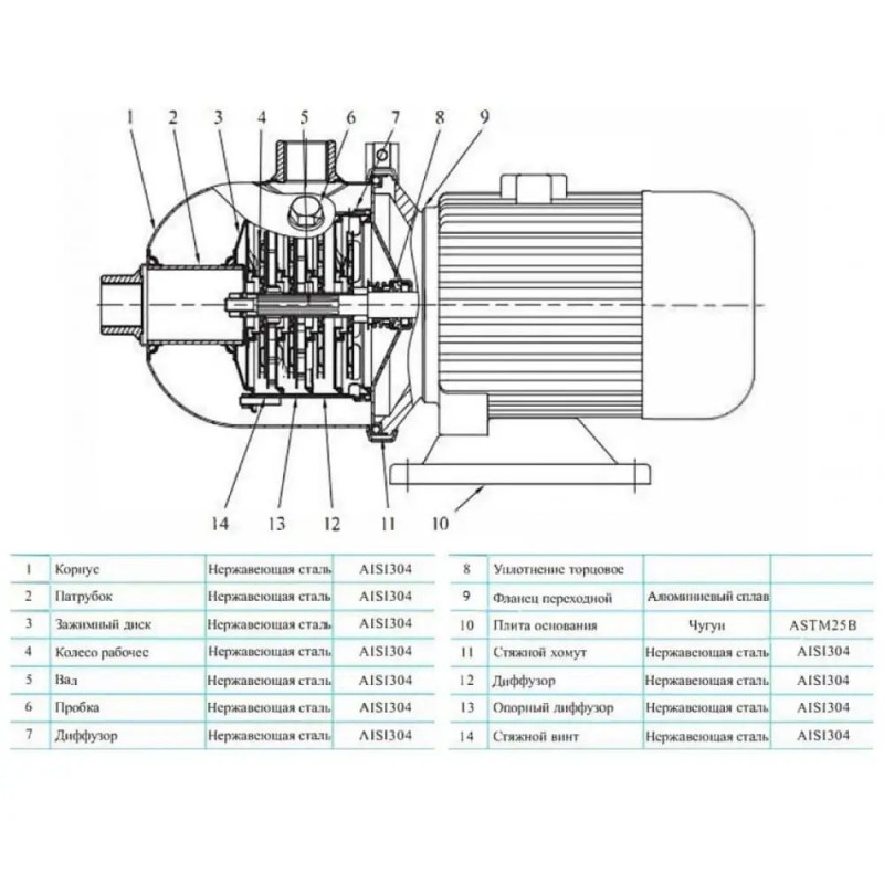 - Рабочие колеса и диффузоры: нержавеющая сталь AISI 304. Рабочие колеса изготовлены методами штамповки и сварки из листовой нержавеющей стали и установлены на удлиненном валу электродвигателя консольно.