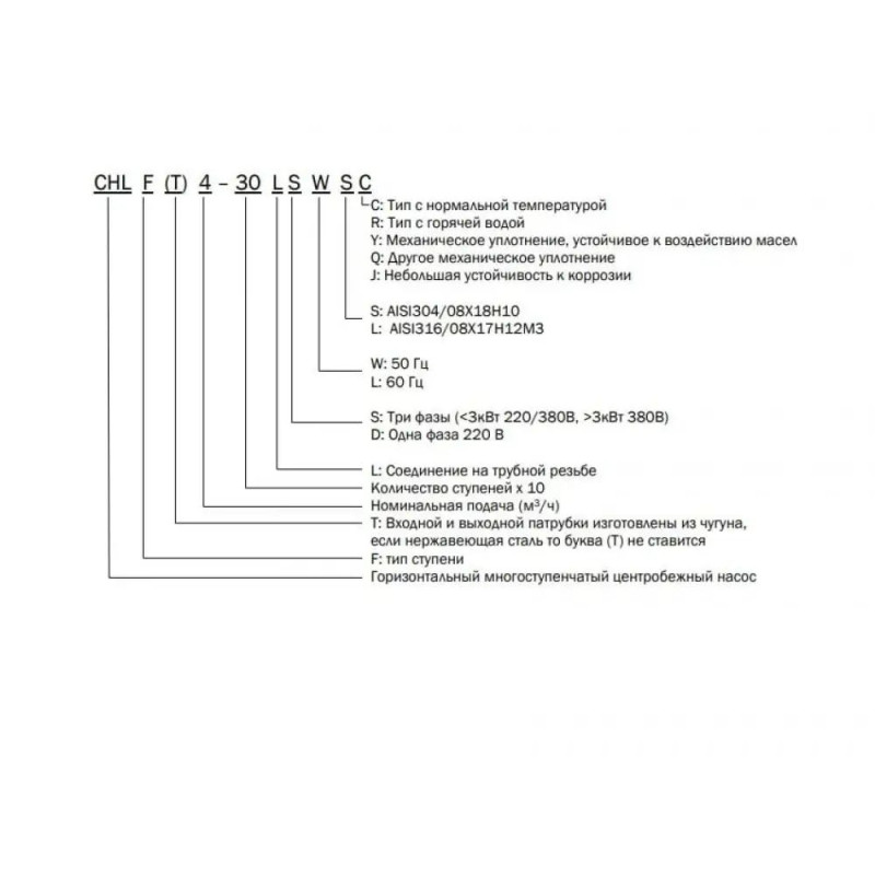CNP CHL 2-20 LSWSC представляет собой трехфазный горизонтальный многоступенчатый несамовсасывающий центробежный электронасос. Насосный агрегат состоит из проточной части и электродвигателя с основанием. Гидравлическая часть собрана из секций (направляющий аппарат + рабочее колесо) на удлиненном валу электродвигателя, стянута с использованием специальных стяжек с резьбовыми концами и помещена в общий корпус, изготовленный из нержавеющей стали.