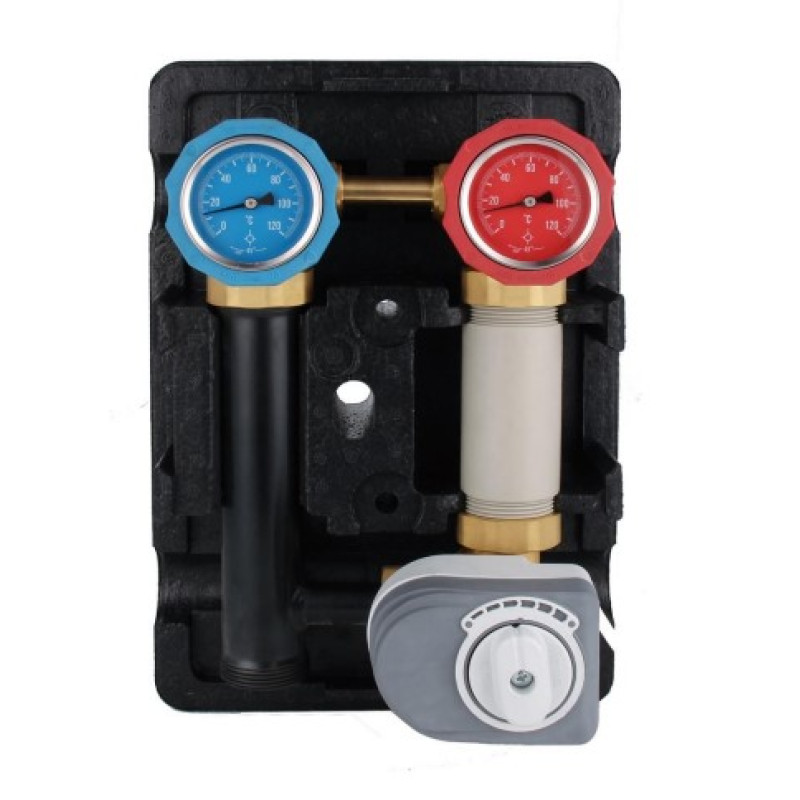 Группа с трёхходовым термостатическим клапаном и сервоприводом предназначена для подачи теплоносителя в контур потребителя c возможностью подмеса холодного теплоносителя из обратной линии контура потребителя, таким образом осуществляя регулировку температуры теплоносителя в подающей линии.