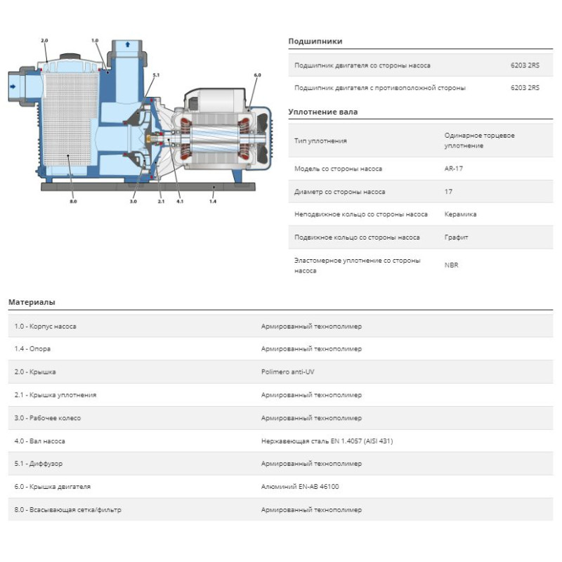 Самовсасывающие центробежные насосы с предварительным фильтром подходят для циркуляции и фильтрации воды в бассейнах, особенно для тех, где требуется большой расход (перелив). Они рекомендуются для рециркуляции воды в малых и средних бассейнах объемом до 180 м3. Воды для использования в плавательных бассейнах (рН 6,5 - 8,4). Установка должна производиться в проветриваемых помещениях, защищенных от непогоды, с достаточным пространством для технического обслуживания.