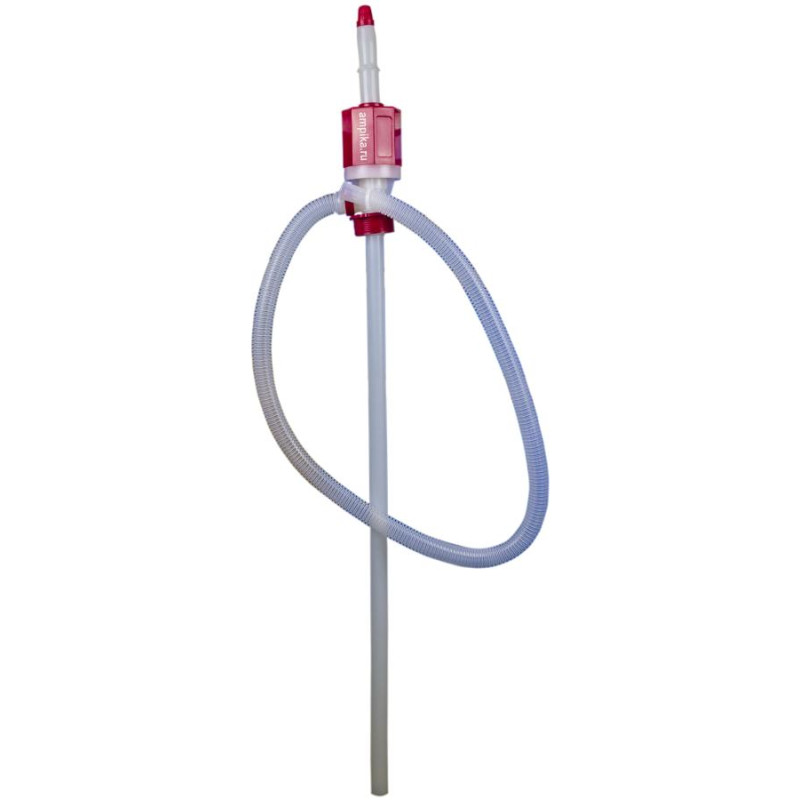 Если приёмная ёмкость стоит на полу, то достаточно несколько раз качнуть сильфоном (гармошкой внутри красного корпуса) для начала тока жидкости, а дальше она течёт самотёком.