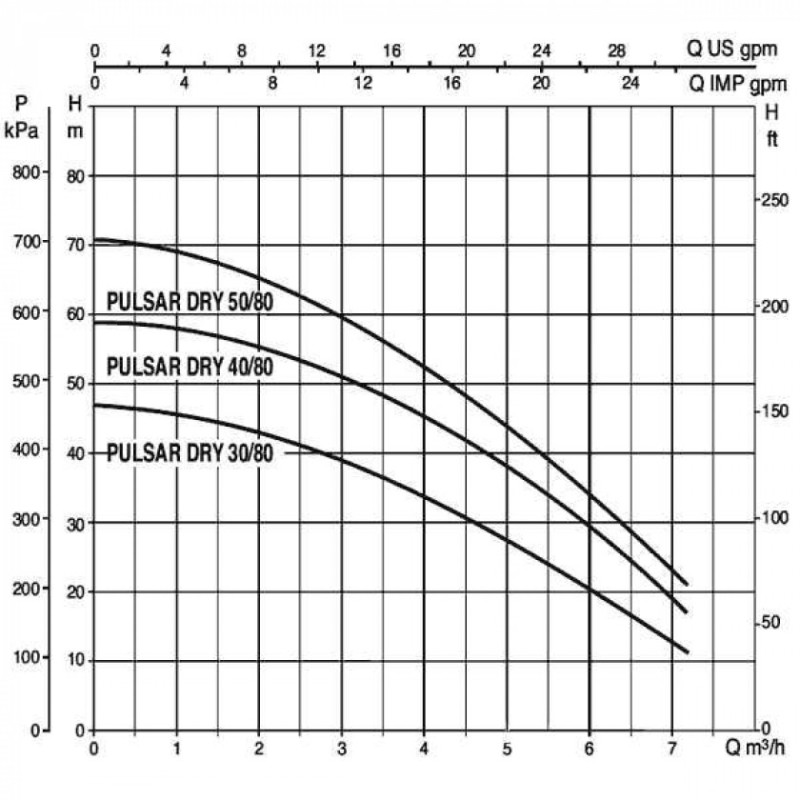 Насос PULSAR DRY 50/80 M-NA разработано специально для индивидуальных и коллективных систем водоснабжения. Рабочий диапазон: производительность – от 0,9 до 7,2 куб.м/ч, напор – до 82 м. водяного столба. Максимальное рабочее давление: максимальная глубина погружения – 20 м. Перекачиваемая жидкость. Состав: чистая, без твердых включений и минеральных масел, не вязкая, химически нейтральная, по характеристикам аналогичная воде. Максимальное содержание песка в воде – 50 г/куб.м. Температура – от 0°С до +40°С. Основные материалы. Рабочие колеса и диффузоры – из технополимера; внешний кожух, кожух двигателя, основание насоса со всасывающим патрубком, вал и крепежные элементы – из нержавеющей стали. Торцевые уплотнения масляной камеры: со стороны гидравлической части – карбид кремния/карбид кремния, со стороны двигателя – графит/керамика. Особенности: Многоступенчатый колодезный насос. Уплотнение вала – масляная камера с двумя торцевыми уплотнениями. Однофазные модели укомплектованы встроенным конденсатором и тепловым выключателем с автоматическим перезапуском. Для трехфазных моделей требуется внешняя защита от перегрузки. Все модели оборудованы всасывающим патрубком. Монтаж. Вал двигателя – в вертикальном положении. Возможен вариант "сухой" установки. При продолжительной работе насос может находиться в не полностью погруженном положении. Комплект поставки: насос в сборе с кабелем 20 м. Стандартное электропитание: 1x230 В, 3x400 В. Степень защиты: IP 68. Класс изоляции: F.