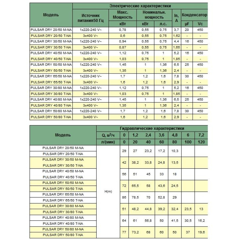 Насос PULSAR DRY 50/80 T-NA разработано специально для индивидуальных и коллективных систем водоснабжения. Рабочий диапазон: производительность – от 0,9 до 7,2 куб.м/ч, напор – до 82 м. водяного столба. Максимальное рабочее давление: максимальная глубина погружения – 20 м. Перекачиваемая жидкость. Состав: чистая, без твердых включений и минеральных масел, не вязкая, химически нейтральная, по характеристикам аналогичная воде. Максимальное содержание песка в воде – 50 г/куб.м. Температура – от 0°С до +40°С. Основные материалы. Рабочие колеса и диффузоры – из технополимера; внешний кожух, кожух двигателя, основание насоса со всасывающим патрубком, вал и крепежные элементы – из нержавеющей стали. Торцевые уплотнения масляной камеры: со стороны гидравлической части – карбид кремния/карбид кремния, со стороны двигателя – графит/керамика. Особенности: Многоступенчатый колодезный насос. Уплотнение вала – масляная камера с двумя торцевыми уплотнениями. Однофазные модели укомплектованы встроенным конденсатором и тепловым выключателем с автоматическим перезапуском. Для трехфазных моделей требуется внешняя защита от перегрузки. Все модели оборудованы всасывающим патрубком. Монтаж. Вал двигателя – в вертикальном положении. Возможен вариант "сухой" установки. При продолжительной работе насос может находиться в не полностью погруженном положении. Комплект поставки: насос в сборе с кабелем 20 м. Стандартное электропитание: 1x230 В, 3x400 В. Степень защиты: IP 68. Класс изоляции: F.
