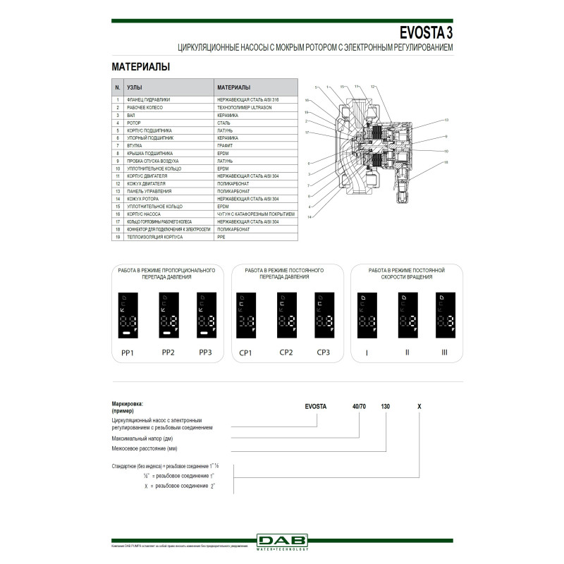 Электронные циркуляционные насосы с мокрым ротором Evosta 3 компании DAB спроектированы для циркуляции воды в бытовых системах отопления и кондиционирования воздуха. Это первый циркуляционный насос с классом защиты IPX5. Синхронный мотор с постоянными магнитами и электронный блок с преобразователем частоты, который автоматически подстраивает характеристики к требованиям системы, обеспечивая экономию электроэнергии и защищая систему от гидравлических ударов. Проектом предусмотрена простая настройка. Одной кнопкой можно последовательно выбирать из девяти режимов функционирования: трех с пропорциональным перепадом давлением, трех с постоянным перепадом давлением и трех с постоянной скоростью. Все модели оборудованы пробкой для спуска воздуха, функцией автоматической дегазации и позволяют в ручном режиме разблокировать вал двигателя. Всасывающий и напорный патрубки с резьбой. Рабочее колесо из технополимера. Имеется теплоизоляционный кожух. Корпус насоса – чугун с катафорезным покрытием, корпус электродвигателя –нержавеющая сталь. Evosta 3 оснащен дисплеем для вывода информации о высоте в метрах выбранной кривой, о потребляемой мощности в данный момент в ваттах, о напоре в данный момент и расходе в данный момент. Благодаря быстросьемному коннектору для подключения кабеля, входящему в комплект поставки, Evosta 3 можно подключить к действующей электросети, без её изменения.