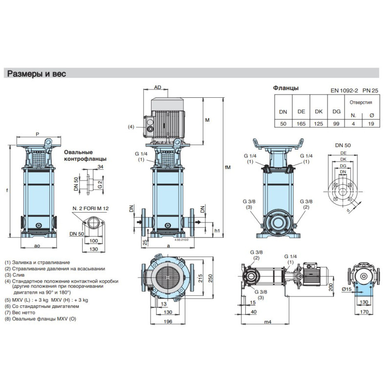 Многорядные вертикальные многоступенчатые насосы Calpeda MXV с всасывающими и подающими раструбами имеют одинаковый диаметр и расположены на одном валу (многорядное исполнение). Насос Calpeda MXV укомплектован упорным подшипником, а также соединением с втулкой для использования любого стандартного двигателя модели V1. Как правило, направляющие втулки смазываются перекачиваемой жидкостью и устойчивы к коррозии.
