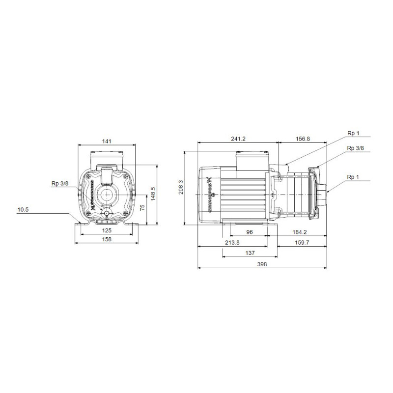 Компактный, надежный, горизонтальный, многоступенчатый, центробежный насос с односторонним всасыванием с осевым всасывающим и радиальным выпускным патрубком. Вал, рабочего колеса и камеры выполнены из нержавеющей стали. Впускные и выпускные части выполнены из чугуна. Механическим уплотнением вала является специально спроектированное, несбалансированное кольцевое уплотнение. Соединение с трубопроводами выполняется через внутреннюю трубную резьбу Витворта, Rp (ISO 7/1). Насос оснащен асинхронным 1-фазным электродвигателем на лапах, с воздушным охлаждением.