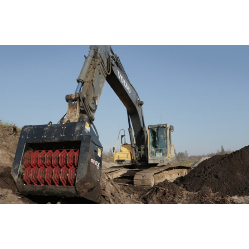 Simex VSE - единственный на сегодняшний момент сортировочный ковш с возможностью регулировки фракции материала на выходе непосредственно из кабины Это делает возможным деление материала на несколько фракций в процессе сортировки, а так же выбор наиболее эффективного соотношения между размером материала и пропускной способностью ковша Адаптация ковша под разные виды материала, путем сменной оснастки, которая не только показывает высокую производительность на ПГС и строительном мусоре, но и на торфе, замазученных или глинистых грунтах Агрессивная оснастка ковша позволяет додрабливать органику при подготовке почвогрунтов Зигзагообразные валы в разы увеличивают пропускную способность ковша по сравнению с аналогичным оборудованием.