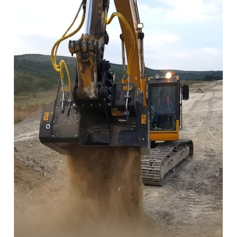 Simex VSE - единственный на сегодняшний момент сортировочный ковш с возможностью регулировки фракции материала на выходе непосредственно из кабины Это делает возможным деление материала на несколько фракций в процессе сортировки, а так же выбор наиболее эффективного соотношения между размером материала и пропускной способностью ковша Адаптация ковша под разные виды материала, путем сменной оснастки, которая не только показывает высокую производительность на ПГС и строительном мусоре, но и на торфе, замазученных или глинистых грунтах Агрессивная оснастка ковша позволяет додрабливать органику при подготовке почвогрунтов Зигзагообразные валы в разы увеличивают пропускную способность ковша по сравнению с аналогичным оборудованием.