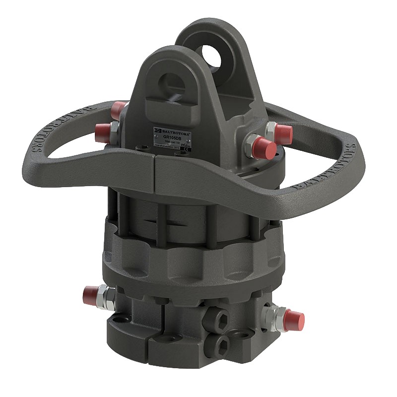 Модификация ротатора GR104DB с двусторонним подключением шлангов. Верхнее присоединение - Шарнирное соединение типа «УШИ». Нижнее присоединение - присоединение ротатора к грейферу с помощью ФЛАНЦА.