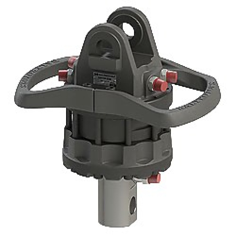 Модификация ротатора GR110-1DB с двусторонним подключением шлангов. Верхнее присоединение - Шарнирное соединение типа «УШИ». Нижнее присоединение - присоединение ротатора к грейферу с помощью ОСИ.