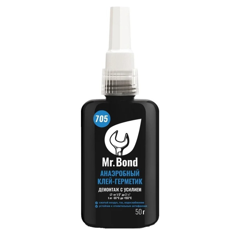 Анаэробный герметик Mr.Bond 705 — это контактный герметизирующий гель синего цвета на акриловой основе, предназначенный для фиксации и герметизации резьбовых соединений со средней степенью фиксации. Обеспечивает надёжную защиту от вибраций, утечек и коррозии, при необходимости допускает демонтаж с усилием. Работает в температурном диапазоне от -50 °C до +150 °C. Упаковка 50 г удобна для точечного или разового применения в бытовых и профессиональных условиях.