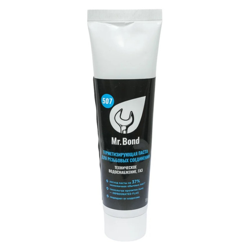 Герметизирующая паста Mr.Bond 507 предназначена для пропитки льна при уплотнении резьбовых соединений, обеспечивая надёжную герметизацию при рабочем давлении до 8 бар и температуре окружающей среды до +140 °C. Паста обладает отличной адгезией, устойчива к вибрациям и старению, подходит для систем водоснабжения и отопления. Поставляется в упаковке массой 70 г, удобной для бытового и профессионального использования.
