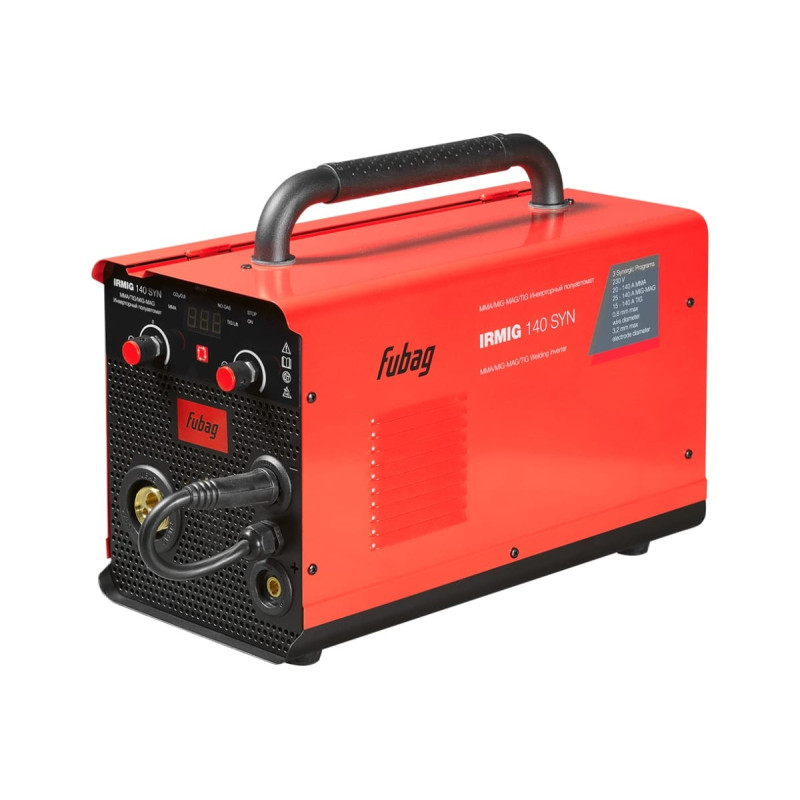 Сварочный инверторный полуавтомат FUBAG IRMIG 140 SYN – универсальный сварочный аппарат, работающий в режимах MIG-MAG, MMA и TIG Lift сварки в самом распространенном диапазоне сварочного тока 15 - 140 А. Аппарат работает с проволокой диаметром 0,8 мм на катушке весом 1кг. диаметром 100 мм. и 5 кг. диаметром 200 мм. Аппарат получил новый запатентованный дизайн - все пластиковые элементы (панель, ручка для переноски) заменены на металлические, что дополнительно повышает надежность и срок службы аппарата. Отличный выбор при проведении различных сварочных работ в небольших мастерских или гараже. Высокую производительность сварочных работ обеспечивает надёжный металлический механизм подачи проволоки. Синергетические программы аппарата позволяют быстро настроить необходимый режим сварки для различных задач. Передняя панель аппарата снабжена 2 ручками: одна отвечает за регулировку тока сварки и скорость подачи проволоки; вторая предназначена для коррекции напряжения синергетических программ. В новом дизайне аппарат получил дополнительную защитную решетку, установленную за передней панелью, для защиты от пыли и других внешних воздействий. Инверторный полуавтомат FUBAG IRMIG 140 SYN оснащен евроразъемом для быстрого и безопасного подключения сварочной горелки. Разъем ММА – DX 16/25 Купив инверторный полуавтомат FUBAG IRMIG 140 SYN, Вы получите в комплекте трехметровую фирменную горелку FB 150А и трехметровый газовый шланг, а также кабель с электрододержателем (1,7 м) и кабель заземления (3 м). Продолжительность включения (ПВ) в режиме MIG составляет 25% при 40С. Эти данные приведены в соответствии с европейским стандартом EN60974-1 при внешней температуре 40С. Инверторный полуавтомат FUBAG IRMIG 140 имеет возможность легкой смены полярности для работы с самозащитной проволокой. Эффективная система охлаждения, а также встроенная функция термозащиты с индикацией перегрева гарантируют долговечность и надежность использования аппарата . Быстрое подключение сварочных кабелей и евроразъем для подключения горелки гарантируют удобство использования.