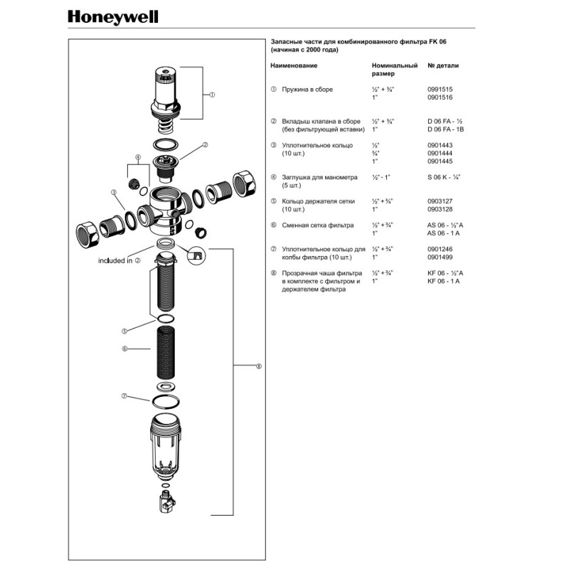 Фильтры Honeywell FK06 представляют собой комбинацию промывного фильтра с клапаном понижения давления для непрерывного водоснабжения фильтрованной водой. Они предотвращают проникновение инородных тел, таких как частицы ржавчины, волокон пеньки или песчинок. Инородные частицы, собранные внутри колбы фильтра, могут быть легко удалены посредством промывки. Клапан понижения давления предупреждает защиту от избыточного давления и понижает расход воды. Каждый из перечисленных элементов в отдельности удовлетворяет требованиям действующих норм DIN/DVGW. Особенности и характеристики индивидуальных элементов также распространяются на всё комбинированное устройство. Небольшие размеры позволяют установить комбинированный фильтр в местах с ограниченным пространством.