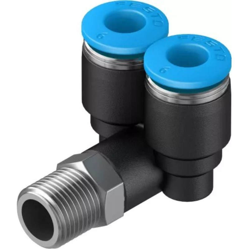 Разветвитель угловой поворотный с наружным шестигранником — Y-образный поворотный штуцер с наружной резьбой и внешним шестигранником. Подходит для использования со шлангами со стандартным наружным диаметром. Входит в состав стандартной серии фитингов Festo Quick Star (QS).