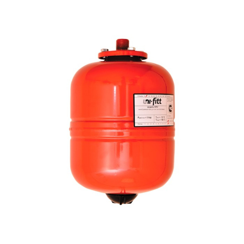 Расширительный бак WRV для отопления вертикальный Uni-Fitt представляет собой мембранный расширительный бак для отопления и предназначен для компенсации температурных расширений теплоносителя в замкнутых системах отопления. Мембранный бак рассчитан на рабочую температуру от -10 оС до +100 оС. Бак выполняется из прочной высококачественной стали и по всей конструкции рассчитаны на многолетнюю эксплуатацию. Внешняя сторона бака имеет эпоксиполиэфирное покрытие красного цвета. Заменяемая мембрана выполняется из специальной резины EPDM.