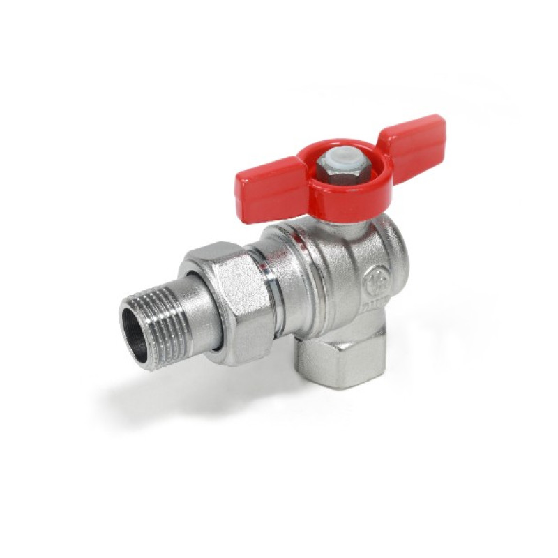 Кран шаровой угловой полнопроходной с отводом, с красной рукояткой-бабочкой, с внешней и внутренней резьбой, хромированный.