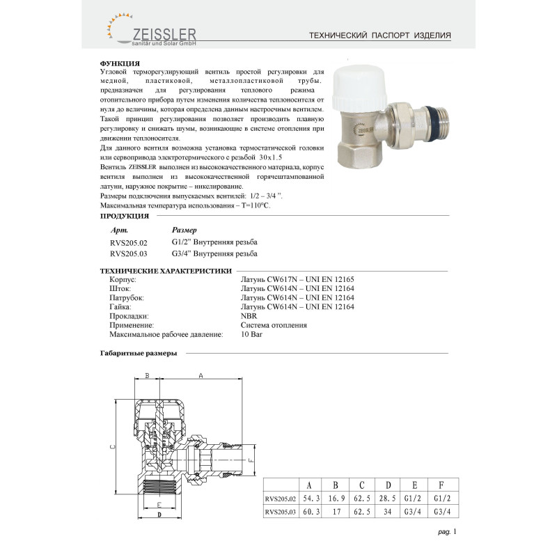 Вентиль терморегулирующий ручной прямой 3/4 Zeissler