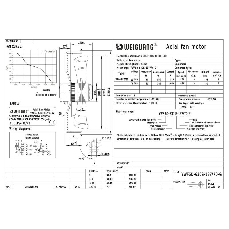 Вентилятор осевой Weiguang YWF6D-630S-137/70-G в сборе с защитной решеткой. Диаметр рабочего колеса 630 мм, производительность 11785 м.куб/час, при напряжении питания 380В/50Гц, потребляемая мощность 500 Вт, скорость вращения 870 об/мин, направление потока воздуха "S"-всасывание. Применяются в составе систем вентиляции, кондиционирования, теплообменных аппаратов в холодильной технике. Имеют встроенную защиту электродвигателя, допустимая температура окружающей среды -30...+60 °C, степень защиты IP54. Диаметр ротора - 137 мм, толщина лопасти - 70 мм.