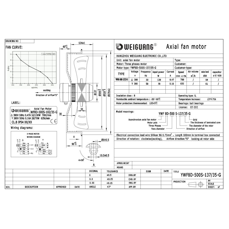 Вентилятор осевой Weiguang YWF8D-500S-137/35-G в сборе с защитной решеткой. Диаметр рабочего колеса 500 мм, производительность 3500 м.куб/час, при напряжении питания 380В/50Гц, потребляемая мощность 130 Вт скорость вращения 700 об/мин, направление потока воздуха - всасывание. Применяются в составе систем вентиляции, кондиционирования, теплообменных аппаратов в холодильной технике. Имеют встроенную защиту электродвигателя, допустимая температура окружающей среды -30...+60 °C, степень защиты IP54. Диаметр ротора - 137 мм, толщина лопасти - 35 мм.